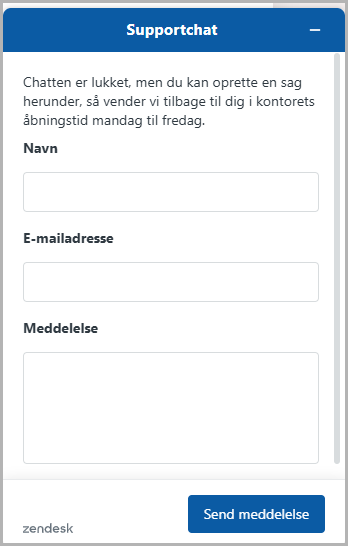 Uden for chattens åbningstider, kan du stadig benytte Hjælp-knappen. Her bliver formularen, som er vist til højre her over, i stedet til en skriftlig sag, som supportteamet tager sig af i åbningstiden, som er mandag til torsdag kl. 8.00 - 16.00, og fredag kl. 8.00 -15.00.